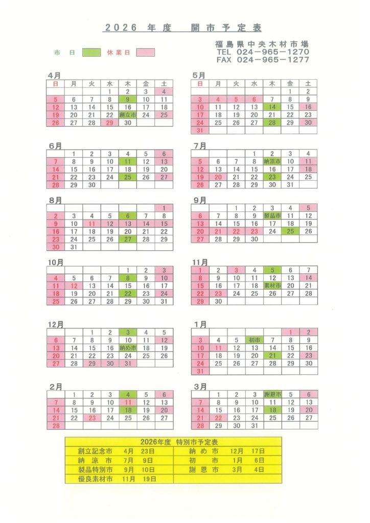 市日・営業時間のご案内 Twitter Facebook はてブ Pocket LINE コピー 2026.03.31 2022.03.02 ・営業時間のご案内 08:00~17:15 ・フォークリフト・グラップルでの 積荷・荷下ろしをご希望のお客様 ・8時より承ります。 ・12時~13時の時間はお昼休みを頂戴しております。 ・16:45まで受付しております。 ・市日のご案内